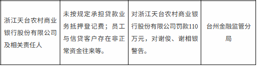 【大河财立方消息】12月17日,国家金融监督管理总局台州监管分局披露的行政处罚信息显示,因未按规定承担贷款业务抵押登记费,员工与信贷客户存在非正常资金往来等,浙江天台农村商业银行被罚110万元,相关责任人谢俊、谢相银被警告。