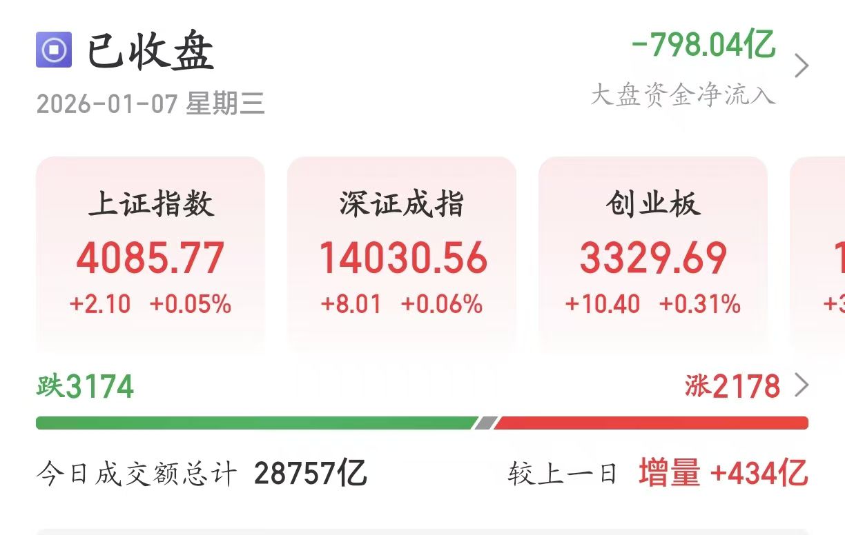 【大河财立方消息】1月7日,A股大盘14连阳,创出史上最长连阳纪录,上涨0.05%,报收4085.77点。深证成指上涨0.06%,创业板指上涨0.31%。