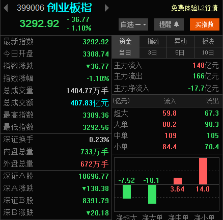 截至发稿,,创业板指下挫跌逾1%,沪指跌0.27%,深成指跌0.70%。油气、光伏、证券等方向跌幅居前,沪深京三市下跌个股近3200只。