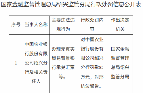 【大河财立方消息】1月8日,国家金融监督管理总局绍兴监管分局披露的行政处罚信息公开表显示,中国农业银行股份有限公司绍兴分行因办理无真实贸易背景银行承兑汇票等,被罚85万元。相关责任人邢杭波受到警告处罚。