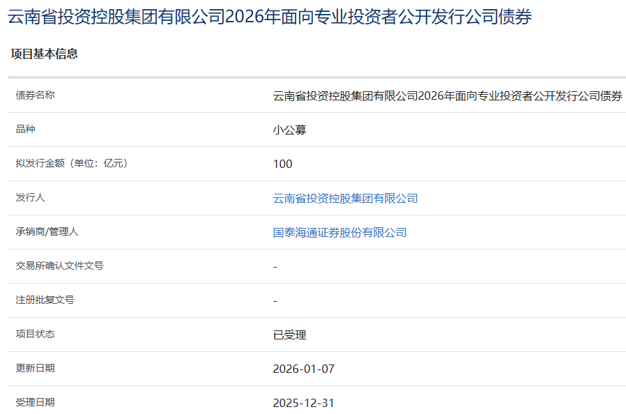 【大河财立方消息】1月8日消息,云南省投资控股集团有限公司2026年面向专业投资者公开发行公司债券项目获上交所受理。