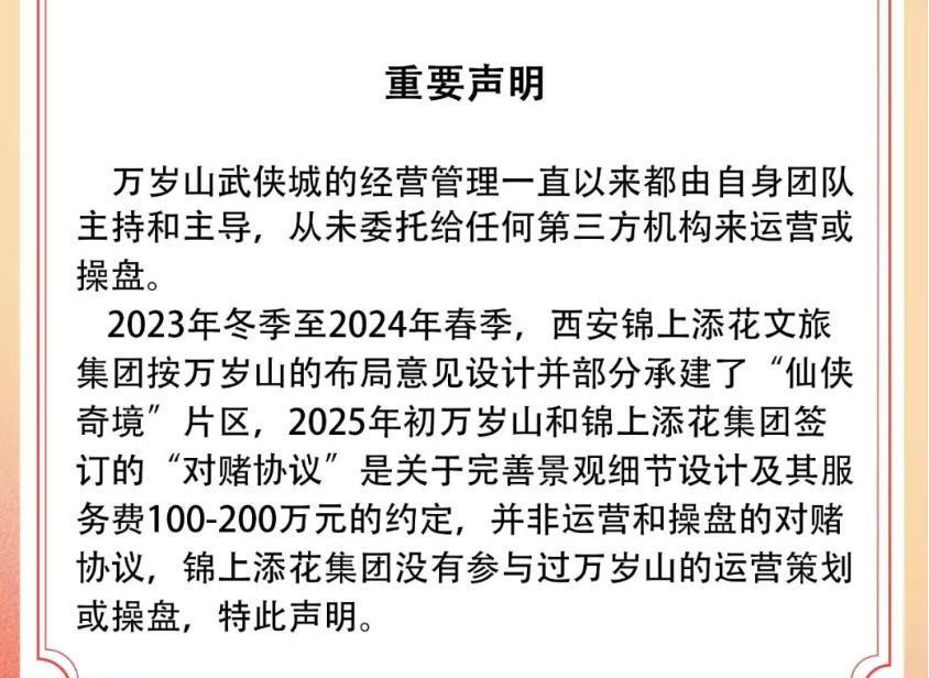 紧接着,万岁山武侠城在2026年1月1日发布的《万岁山武侠城及合作景区经营数据2025年报》中发布了一则重要声明:万岁山武侠城的经营管理一直以来都由自身团队主持和主导,从未委托给任何第三方机构来运营或操盘。2023年冬季至2024年春季,西安锦上添花文旅集团按万岁山的布局意见设计并部分承建了“仙侠奇境”片区,2025年初万岁山和锦上添花集团签订的“对赌协议”是关于完善景观细节设计及其服务费100万—200万元的约定,并非运营和操盘的对赌协议,锦上添花集团没有参与过万岁山的运营策划或操盘。