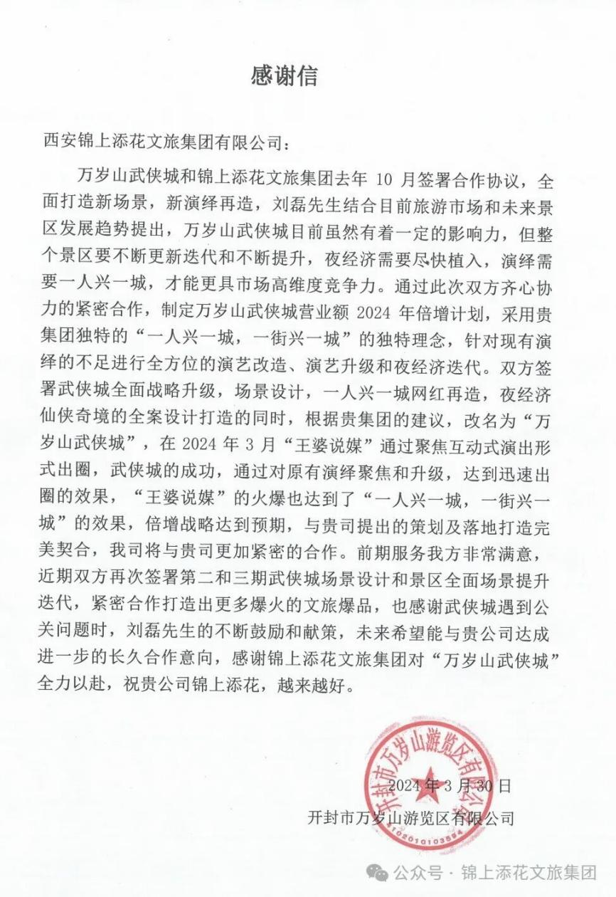 此外,锦上添花还曾发布一篇名为《刘磊:我改万岁山武侠城名字的七点原因》的文章,称其董事长刘磊力排众议,建议将原景区名“万岁山·大宋武侠城”改名为“万岁山武侠城”。该集团还晒出了一封盖有“开封市万岁山游览区有限公司”公章的感谢信,印证了上述说法。