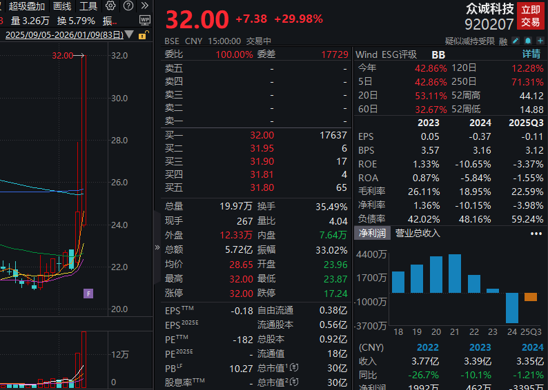 【大河财立方消息】1月9日,众诚科技股价30%涨停,成交额放量达5.72亿元,换手率达35.39%。