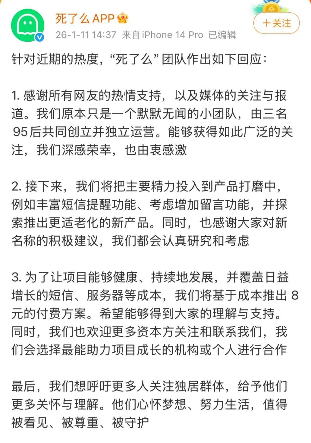 【大河财立方消息】1月11日,近日爆火的“死了么”App官方发声,回应近期更名热议,并表示后期将升级产品功能。