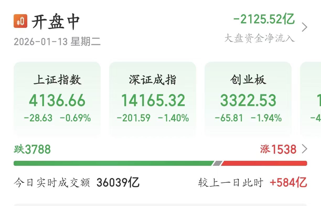 【大河财立方消息】1月13日午后,沪深京三市成交额超3.6万亿元,较上日此时放量584亿元。
