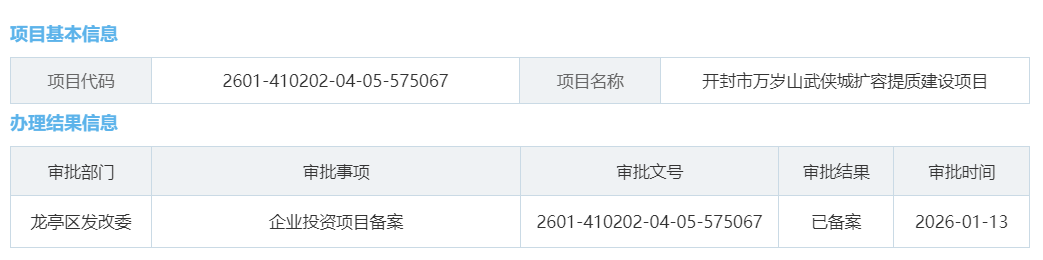 【大河财立方消息】1月13日,开封市万岁山武侠城扩容提质建设项目,获开封市龙亭区发改委审批备案。