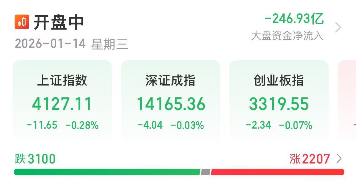【大河财立方消息】1月14日,指数午后快速回落,三大指数集体翻绿,创业板指、深成指此前一度涨超2%。