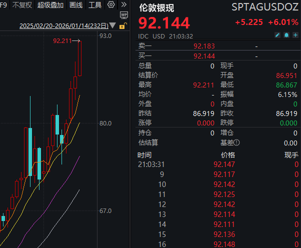【大河财立方消息】1月14日晚间,现货白银日内涨幅扩大至6%,突破92美元/盎司,续创历史新高。2026年以来,现货白银累涨超28%。