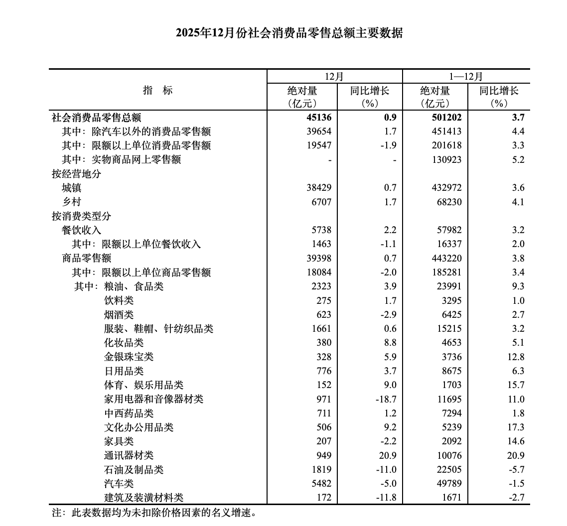 【大河财立方消息】1月19日,国家统计局公布数据显示,12月份,社会消费品零售总额45136亿元,同比增长0.9%。其中,除汽车以外的消费品零售额39654亿元,增长1.7%。2025年,社会消费品零售总额501202亿元,比上年增长3.7%。其中,除汽车以外的消费品零售额451413亿元,增长4.4%。