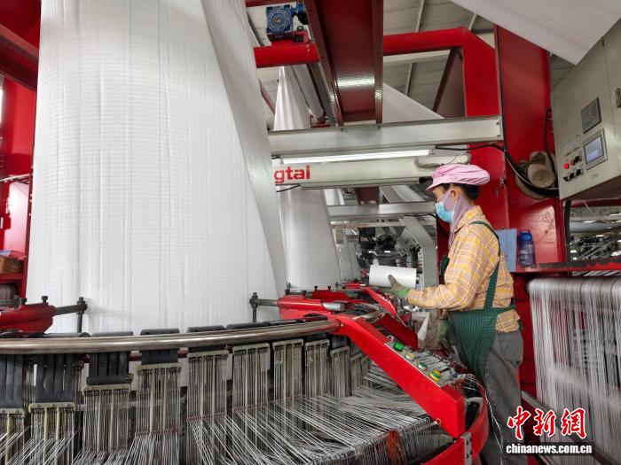 1月13日,儋州伟达化工有限公司生产车间内,工人正利用上游企业生产的聚乙烯开展再加工,制作集装吨袋。中新社记者 王子谦 摄