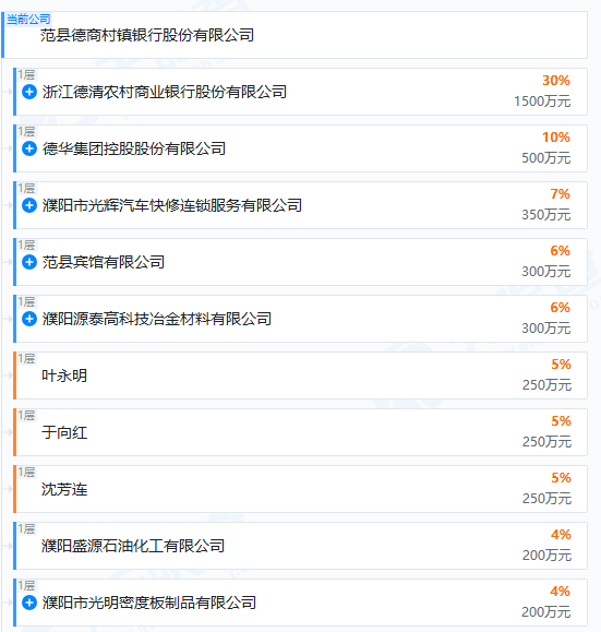天眼查显示,范县德商村镇银行股份有限公司成立于2013年,位于河南省濮阳市,注册资本5977.552万人民币。该银行由浙江德清农村商业银行等多家机构共同持股。