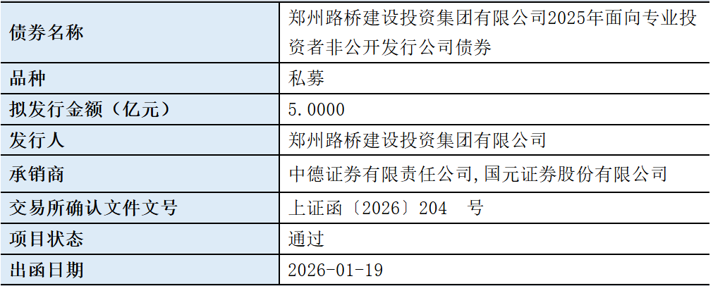 【大河财立方消息】1月20日消息,郑州路桥建设投资集团有限公司2025年面向专业投资者非公开发行公司债券项目获上交所通过。