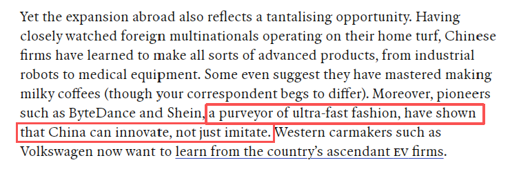 文章最后说,未来全球消费者或将邂逅更多中国品牌。