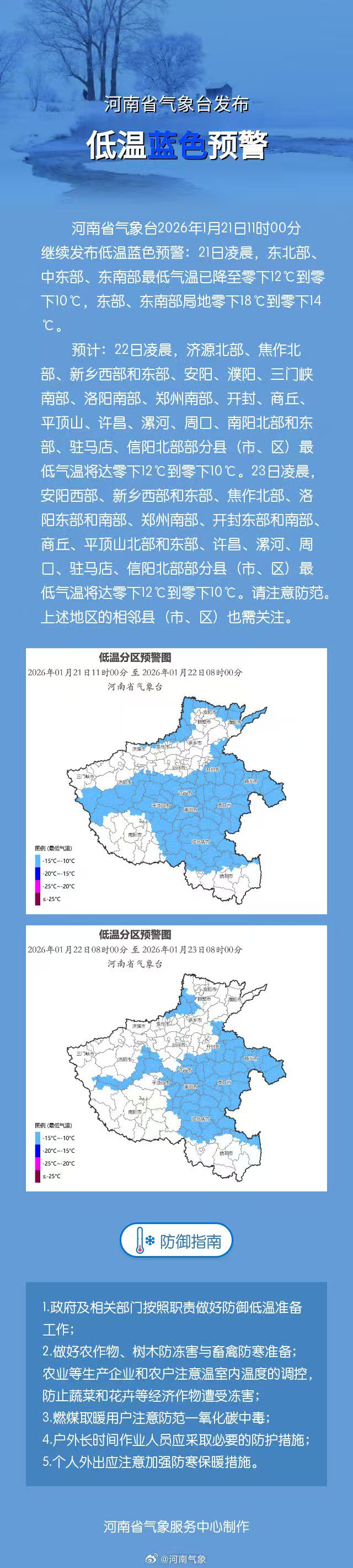 【大河财立方消息】1月21日11时00分,河南省气象台继续发布低温蓝色预警:21日凌晨,东北部、中东部、东南部最低气温已降至零下12℃到零下10℃,东部、东南部局地零下18℃到零下14℃。