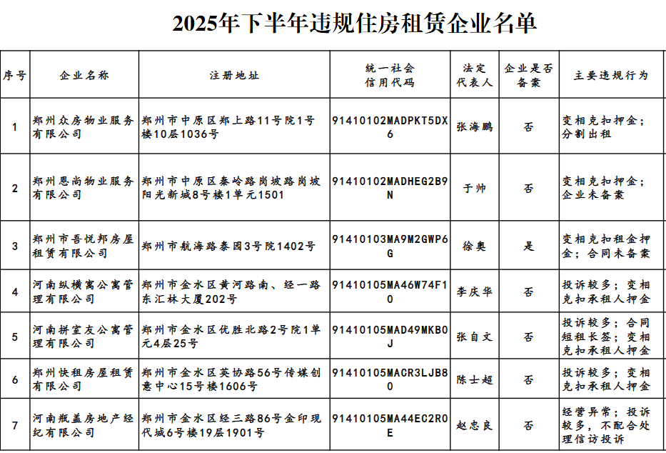 【大河财立方消息】1月20日,郑州市住房保障和房地产管理局发布租房消费警示称,近期,该局结合2025年下半年全市房屋租赁信访投诉情况,排查出16家住房租赁企业存在严重违规行为,涉及变相克扣租房押金、房屋隔断出租、企业不备案、租赁合同不备案、未按要求开展住房租赁资金监管、推诿投诉调解等问题,严重侵害租客权益。