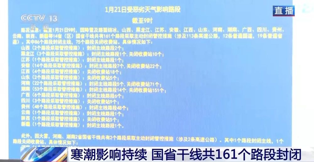 总台央视记者孙继文在交通运输部综合调度指挥中心了解到,这一轮寒潮带来的低温雨雪冰冻天气对交通出行的影响还在持续中。截至上午9时,因降雪及路面结冰,山西、黑龙江、江苏、安徽、江西、山东、河南、湖南、广西、四川、贵州、云南、陕西、新疆14省(区)国省干线共有161个路段采取主动封闭管控措施,其中86个路段封闭主线,75个路段关闭收费站。相较于昨天,情况稍有好转。