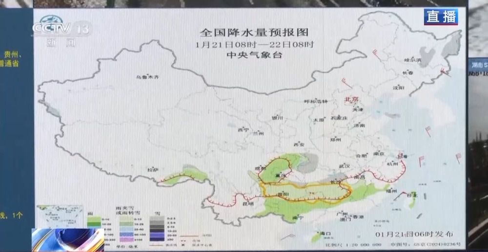 通过气象地图,能观察到霜冻线比起昨天继续南移,画面中只剩下小部分的浅灰色,也就是小雪,浅绿色部分代表小雨或者雨夹雪。中央气象台昨晚发布冰冻黄色预警和寒潮、大风蓝色预警,贵州、广西、湖南、江西等地部分地区还出现冻雨或冰粒。各地交通部门也在加强气象会商研判,落实灾害天气主动防御各项措施,加强低温雨雪冰冻灾害防范应对。