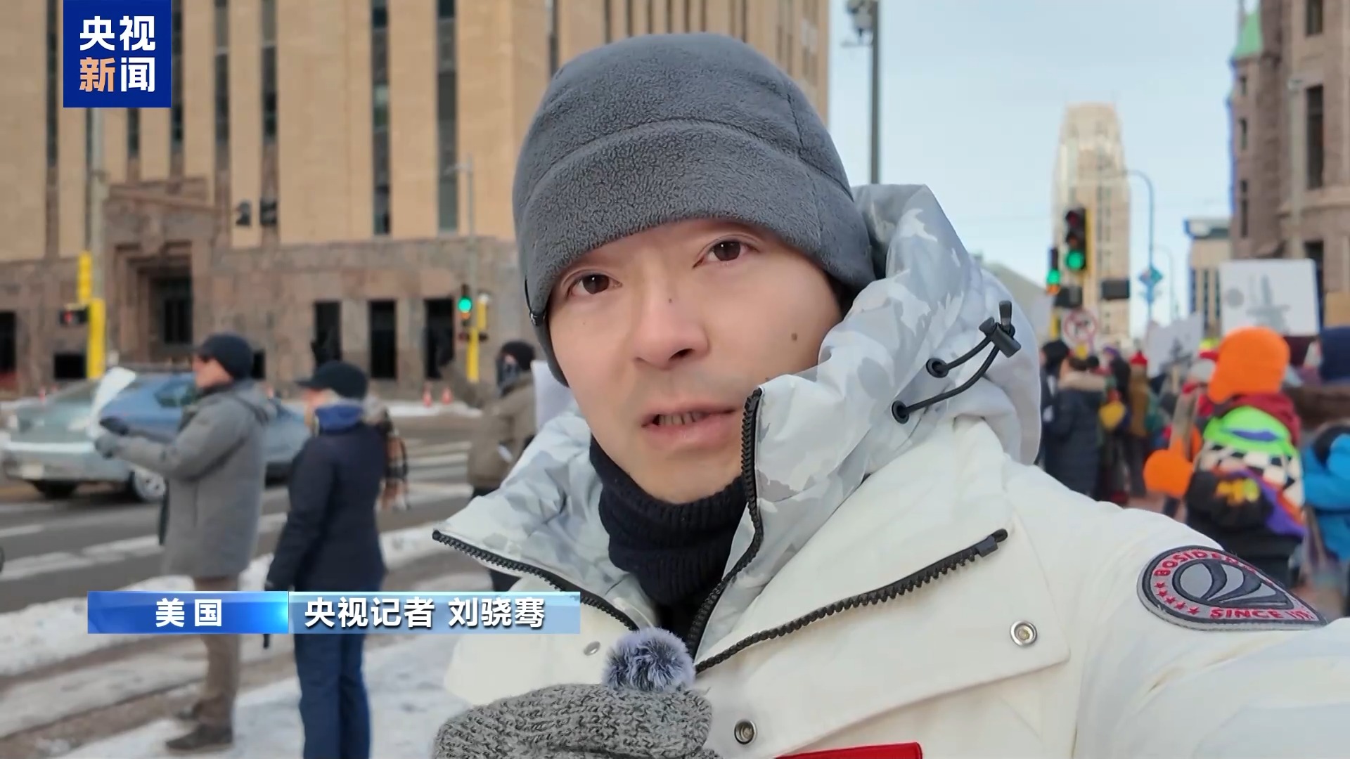 央视记者刘骁骞:这里是明尼阿波利斯市的市中心,虽然当地的极寒天气延续,但是依然有很多民众走上街头,以此来响应当地时间20日全国性的抗议活动。