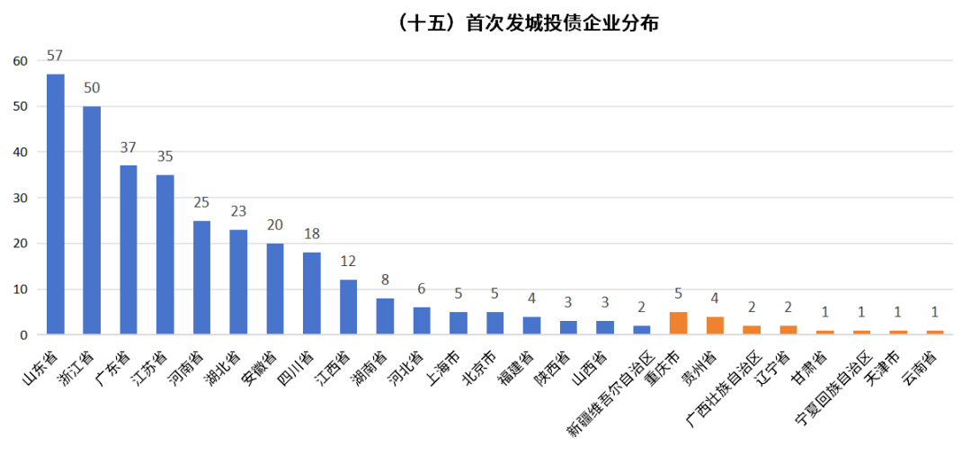 ■2025年共有330家城投平台首次发行债券,分布在25个省,其中山东、浙江、广东、江苏四省首次发债主体数量合计占比达54.2%;12个化债重点省份中,首次发债主体合计不足20家。