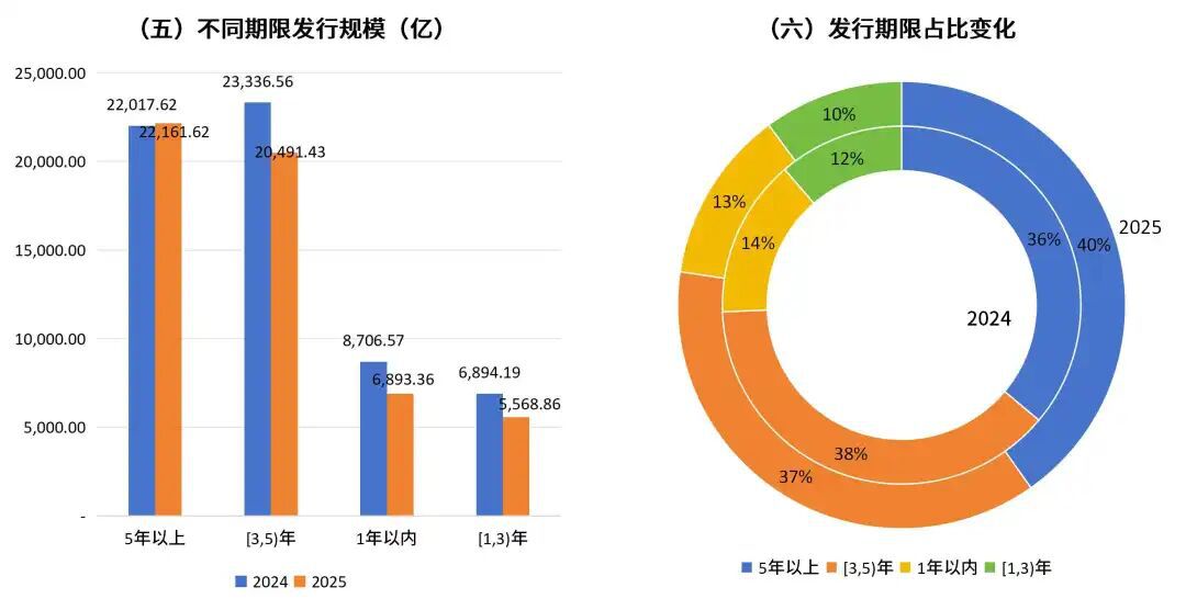 ■从同比变动看,全国呈现“14增17降”的格局,省份间差异显著。宁夏回族自治区成为同比增幅最大的省份,主要由于去年基数较低,仅32.5亿元,今年增至99.5亿元,增幅高达206%。湖北省则以572.78亿元的绝对增量位居全国首位。降幅方面,青海省同比降幅最大,达80%,由57.45亿元降至11.25亿元。江苏省虽发行规模最大,但同比减少2,538亿元,为全国下降规模最大省份。此外,浙江省和天津市减少规模也超千亿,均与区域债务管控政策相关。
