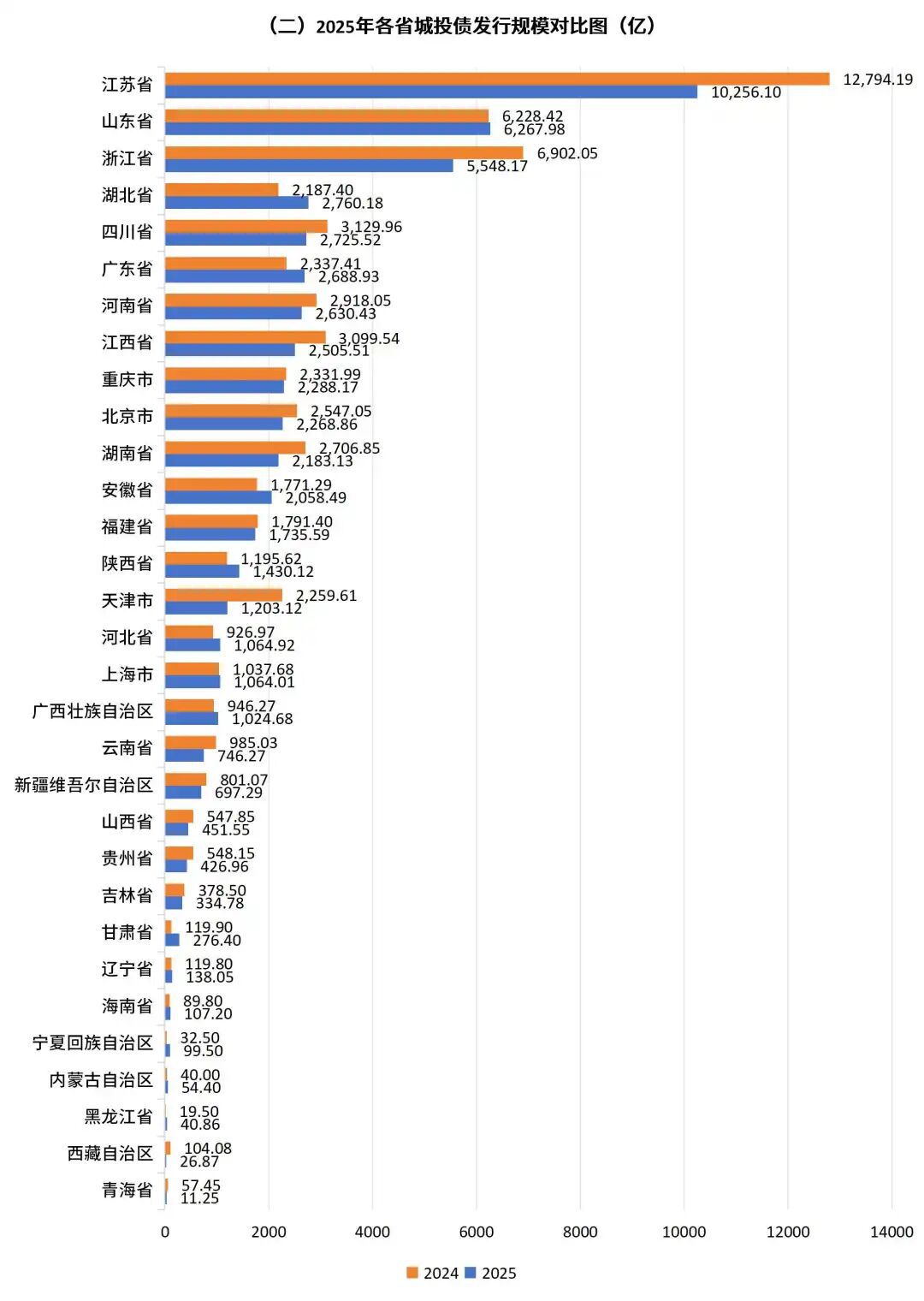 2025年全国31个省、自治区、直辖市均有城投债发行。发行规模高度集中在江苏(超1万亿)、山东、浙江三省,合计占比超40%;尾部省份如青海、西藏不足30亿元;