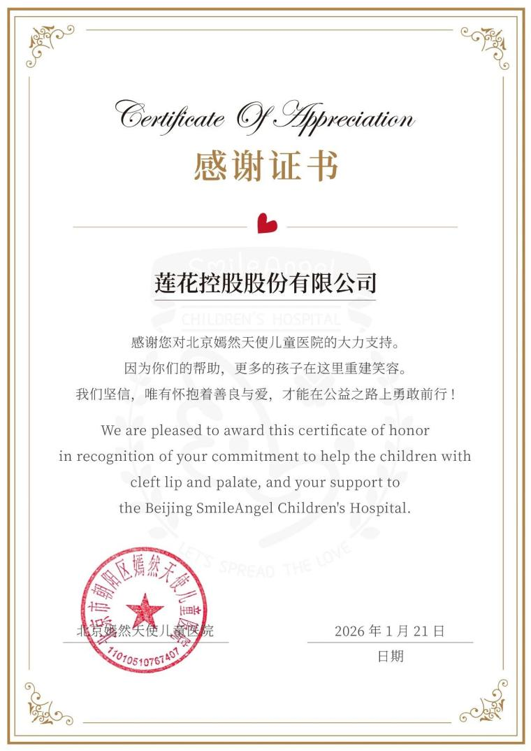 作为拥有四十余年发展历程的国货品牌,莲花控股始终坚守上市公司的社会责任与担当,广泛参与救灾、抗疫、扶贫、助学等公益事业,连续多年荣获“河南省食品行业履行社会责任优秀企业”称号,为经济社会和谐发展贡献力量。此次捐赠,更是莲花控股聚焦困境儿童帮扶、践行公益初心的又一具体体现。