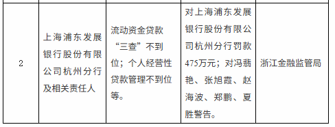 【大河财立方消息】1月21日,国家金融监督管理总局浙江监管局披露的行政处罚信息公开表显示,上海浦东发展银行股份有限公司杭州分行因流动资金贷款“三查”不到位;个人经营性贷款管理不到位等,被罚475万元。