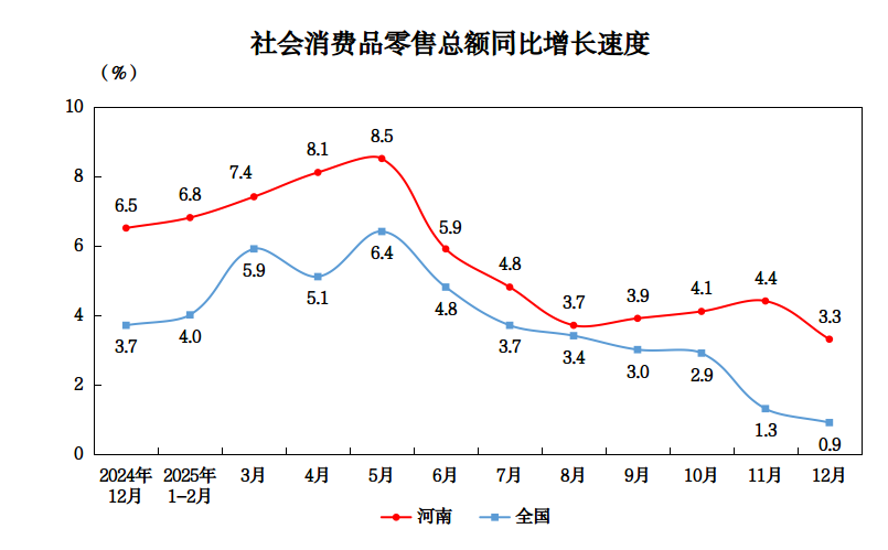 12月份,河南省社会消费品零售总额2675.35亿元,同比增长3.3%,高于全国2.4个百分点。其中,限额以上单位消费品零售额783.30亿元,增长2.3%。
