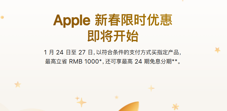 【大河财立方消息】1月22日,苹果中国官网最新上线新春限时优惠活动,用户于2026年1月24日0时1分至1月27日23时59分以符合条件的支付方式购买iPhone、Mac、iPad和Apple Watch等指定产品最高立省1000元。不过,最新发布的iPhone 17系列手机产品不在降价范围内。
