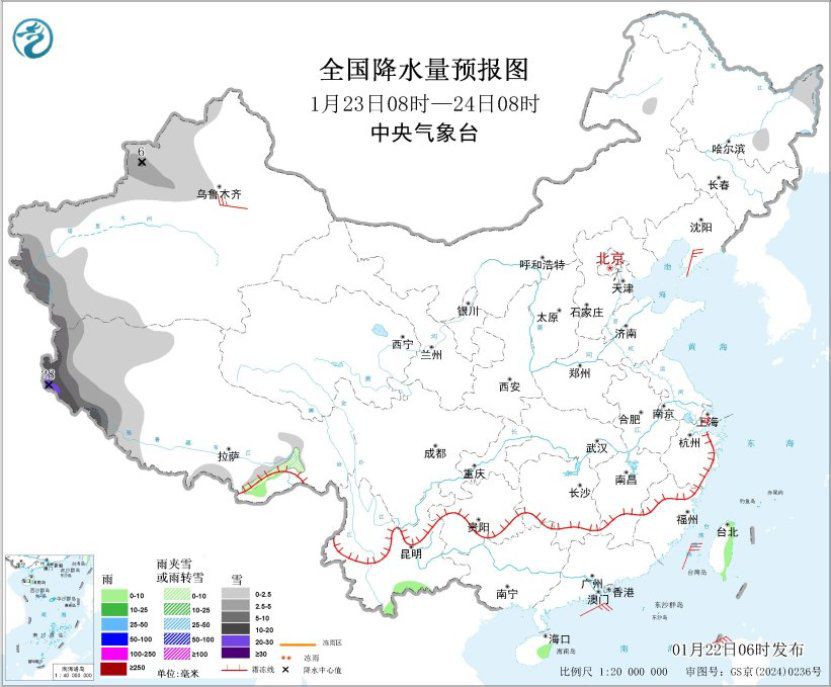 需要注意的是,1月22日夜间至24日,新疆西部、西藏西南部的部分地区有中到大雪,局地有暴雪或大暴雪。期间,青藏高原自西向东将出现小到中雪,降雪过后气温下降6~8℃,局地可超过10℃。