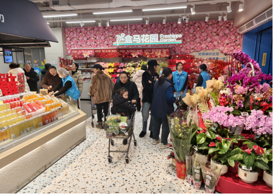 1月23日上午,盒马鲜生商丘睢阳万达广场门店尚未开门,门口已排起长队,8点58分,顾客有序进入门店,奔向鲜花岛、烘焙区、海鲜区、零食区等挑选中意的商品。
