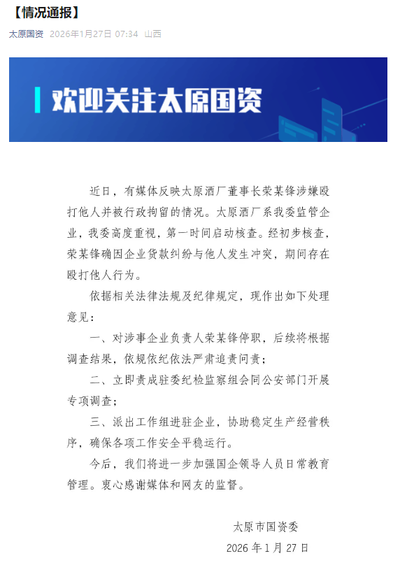 今日,太原市国资委发布情况通报称,太原酒厂系太原市国资委监管企业,太原市国资委高度重视,第一时间启动核查。经初步核查荣某锋确因企业货款纠纷与他人发生冲突,期间存在殴打他人行为。