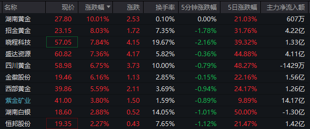 贵金属概念中,湖南黄金涨停,招金黄金、晓程科技、盛达资源、四川黄金、西部黄金等涨幅居前。
