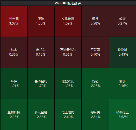 板块方面,贵金属、保险、银行、培育钻石、黄金珠宝、保险等概念涨幅居前。锂电、电池、储能、精细化工、电网、生物科技等概念跌幅居前。