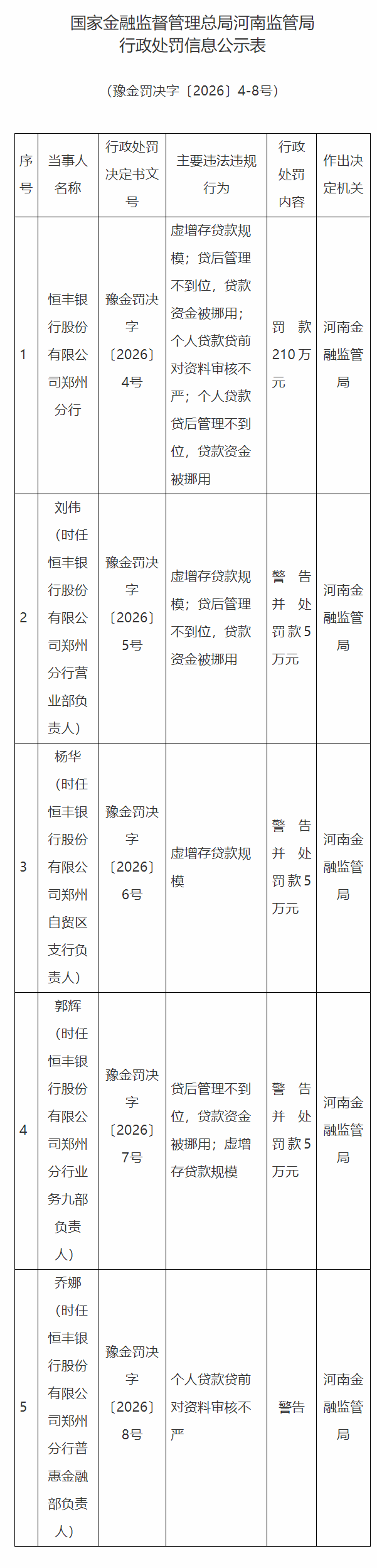 同时,河南金融监管局对时任恒丰银行郑州分行营业部负责人刘伟警告并处罚款5万元;对时任恒丰银行郑州自贸区支行负责人杨华警告并处罚款5万元;对时任恒丰银行郑州分行业务九部负责人郭辉警告并处罚款5万元;对时任恒丰银行郑州分行普惠金融部负责人乔娜警告。