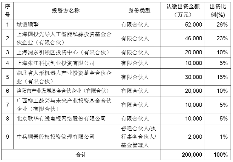 斌铠顺擎认缴出资5.2亿元,占比26%;上海国投先导人工智能私募投资基金认缴出资4.6亿元,占比23%;湖北省人形机器人产业投资基金认缴出资3亿元,占比15%;上海浦东引领区投资中心(有限合伙)、洛阳市产业发展基金均认缴出资2亿元,占比10%;上海张江科技创业投资有限公司、广西柳工战兴与未来产业投资基金、北京歌华有线电视网络股份有限公司均认缴出资1亿元,占比5%;中兵顺景认缴出资2000万元,占比1%。