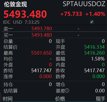 【大河财立方消息】1月29日,现货黄金首次突破5500美元/盎司,日内涨1.58%。截至发稿,现货黄金回落至5493.48美元/盎司。