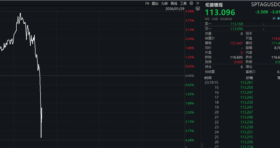 【大河财立方消息】1月29日晚间,现货白银价格快速跳水,跌超4%,一度跌至112美元/盎司,1个小时前还曾大涨4%。