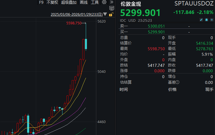 现货黄金同样大跌,失守5300美元/盎司关口。