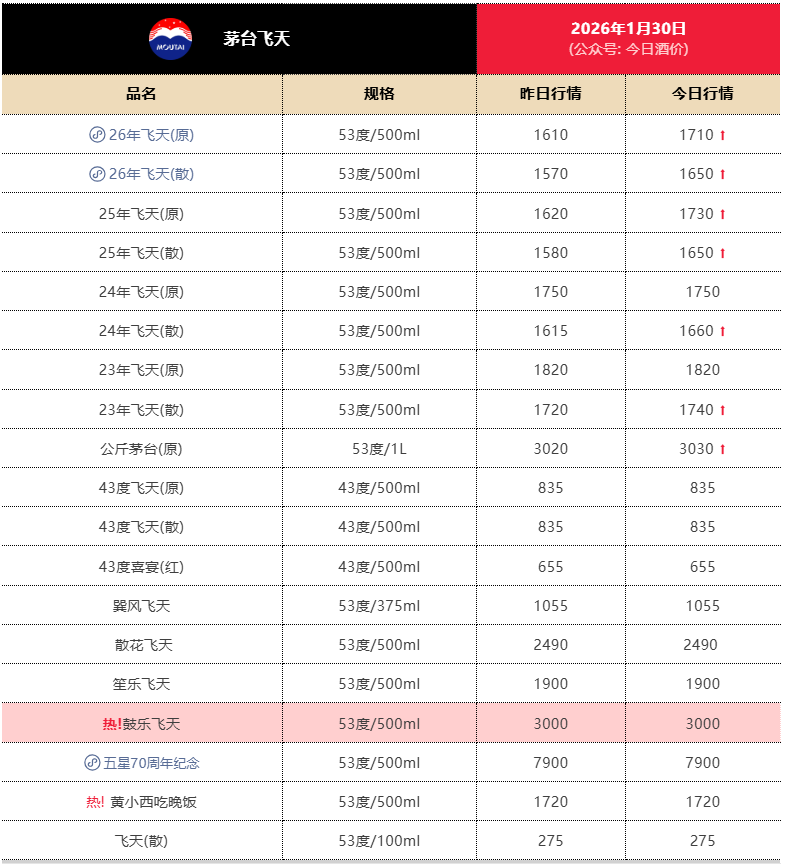 1月30日,“今日酒价”披露的批发参考价显示,26年飞天茅台原箱较前一日上涨100元,报1710元/瓶;26年飞天茅台散瓶较前一日上涨80元,报1650元/瓶。25年飞天茅台原箱较前一日上涨110元,报1730元/瓶;25年飞天茅台散瓶较前一日上涨70元,报1650元/瓶。24年飞天茅台原箱较前一日价格未变,报1750元/瓶;24年飞天茅台散瓶较前一日上涨45元,报1660元/瓶。