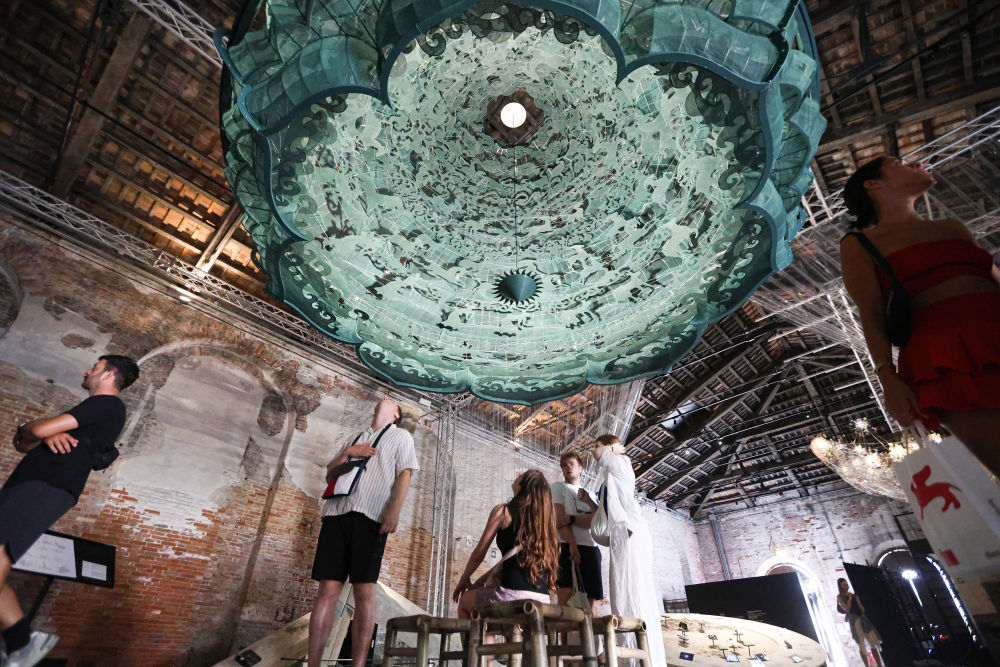 2025年7月16日,在意大利威尼斯,参观者在第19届威尼斯国际建筑双年展中国馆观看展品《苍穹》。本届中国馆展览以良渚文明、敦煌石窟、北京中轴线、城市交通与未来城市为主题,展现中国建筑在传统与未来之间的对话与思考。