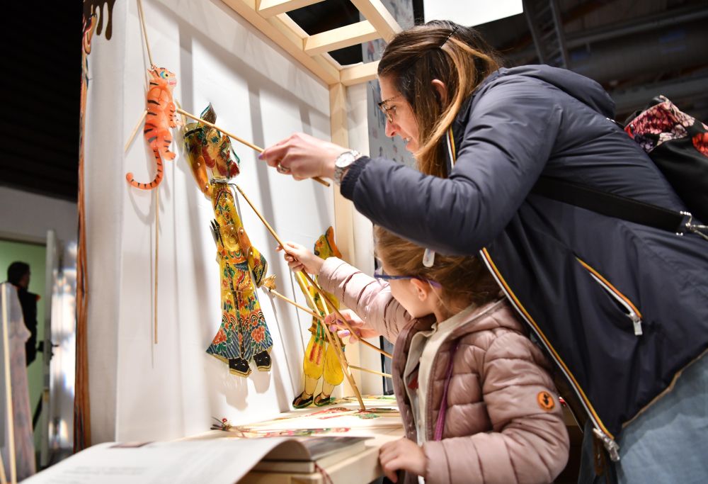 2023年4月25日,在意大利佛罗伦萨举办的国际手工艺展览会上,参观者体验中国皮影文化。