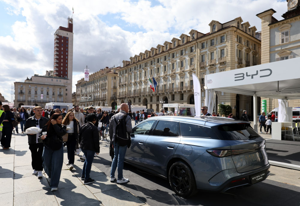 2025年9月27日,人们在2025年都灵车展上参观比亚迪汽车展区。在2025年都灵车展上,中国汽车品牌备受瞩目,共有17家中国汽车企业携新车型参展,约占总参展商数量的三分之一。