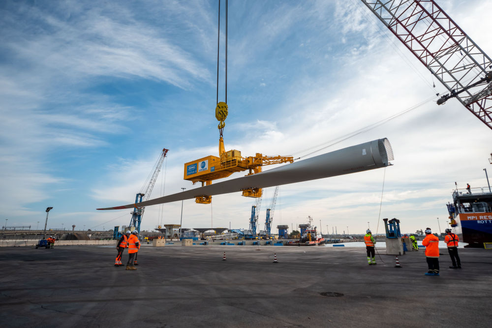 2022年1月27日,在意大利南部海港塔兰托,中国和意大利施工人员吊装风电叶片。中国技术、国际合作让意大利向着增加清洁能源、应对气候变化的目标又迈进了一步。