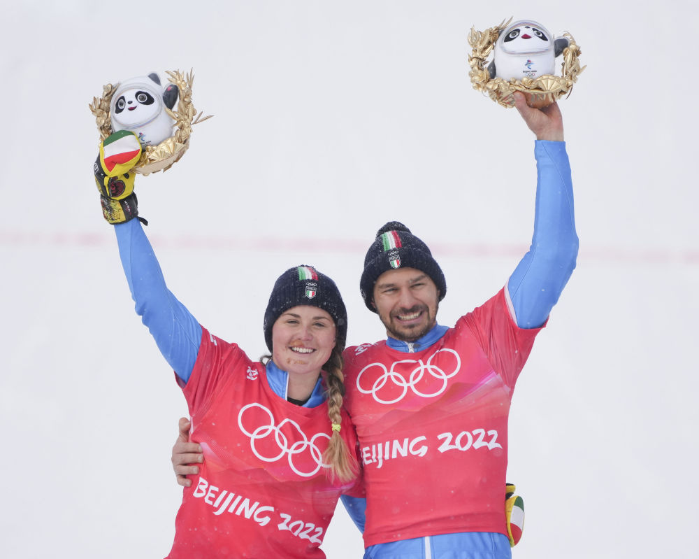 2022年2月12日,获得北京2022年冬奥会单板滑雪障碍追逐混合团体比赛亚军的意大利选手米凯拉·莫约利(左)和奥马尔·维辛廷在颁发纪念品仪式上。