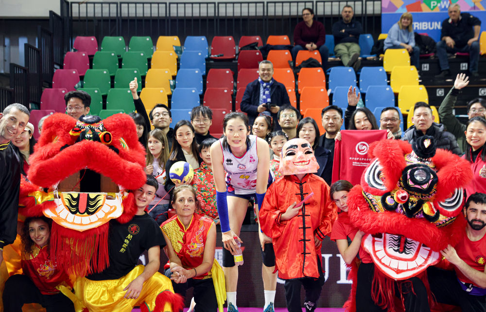 2024年2月4日,在意大利斯坎迪奇,斯坎迪奇队球员朱婷与当地舞龙舞狮表演者和观众在赛后合影。该舞龙舞狮表演队由意大利当地的中国功夫爱好者组成。