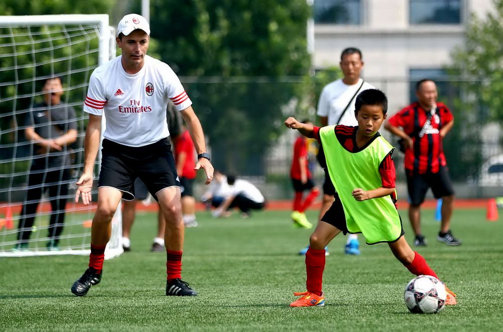 2016年7月28日,AC米兰足球俱乐部专业足球教练托马斯(左)在指导学生训练。当日,北京市大兴区魏善庄镇教育委员会与意大利AC米兰足球俱乐部中国青训营合作开展的校园足球培训项目在魏善庄中学开营。