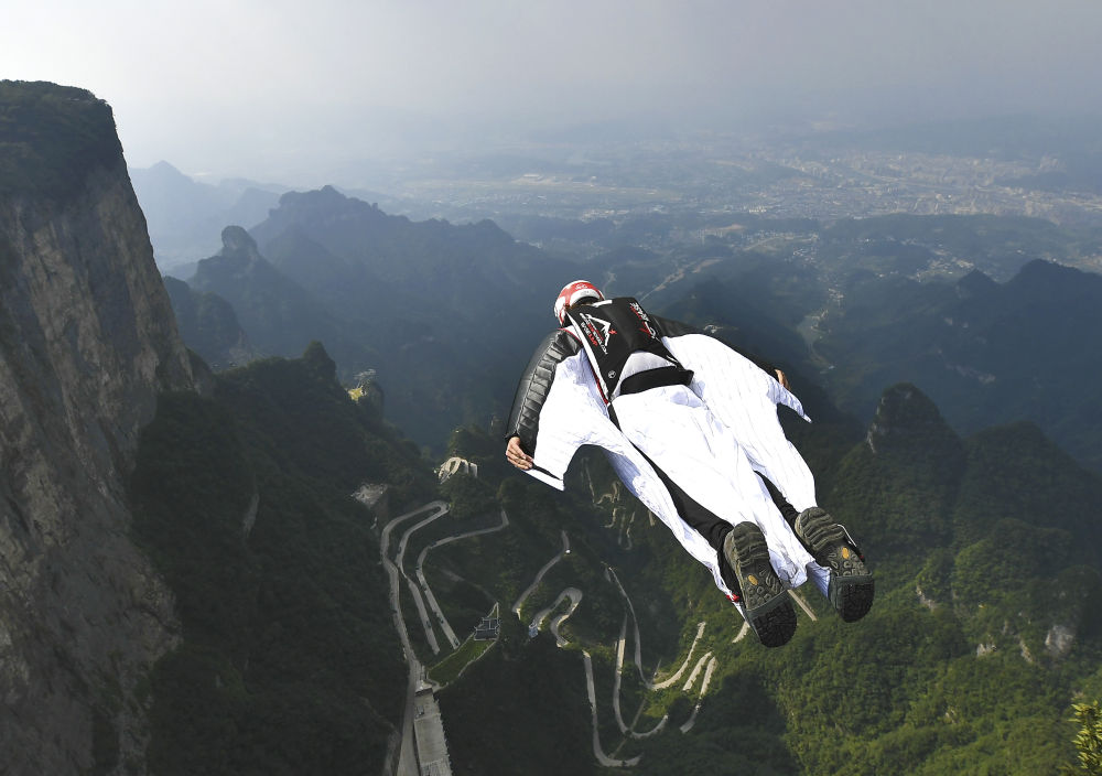 2019年9月4日,意大利选手卢卡·巴尔维里在张家界天门山进行第八届翼装飞行世界锦标赛试飞。