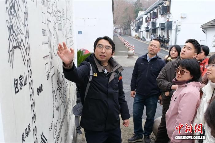 2月5日,魏祝挺(左一)向寻踪团介绍吴越国遗迹。曹丹 摄